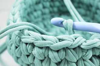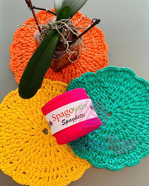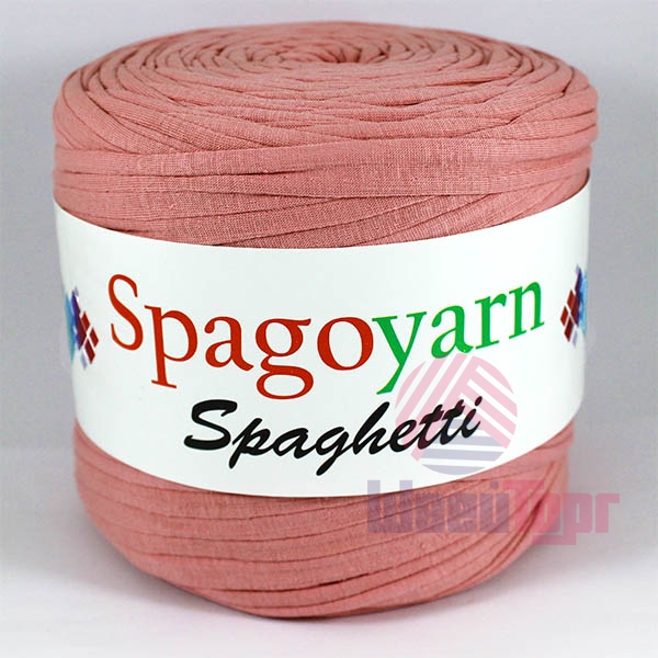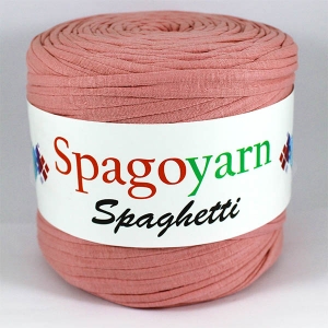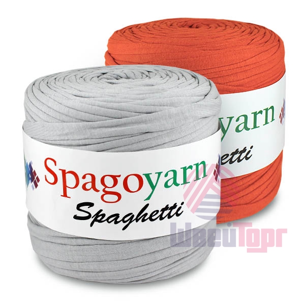 Spagoyarn Spaghetti - ленточная трикотажная пряжа для вязания аксессуаров и предметов интерьера. Пряжа вторичная, изготовлена из остатков текстильного производства. Изделия из трикотажной ленты прекрасно держат форму и пользуются популярностью.
