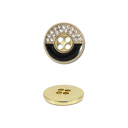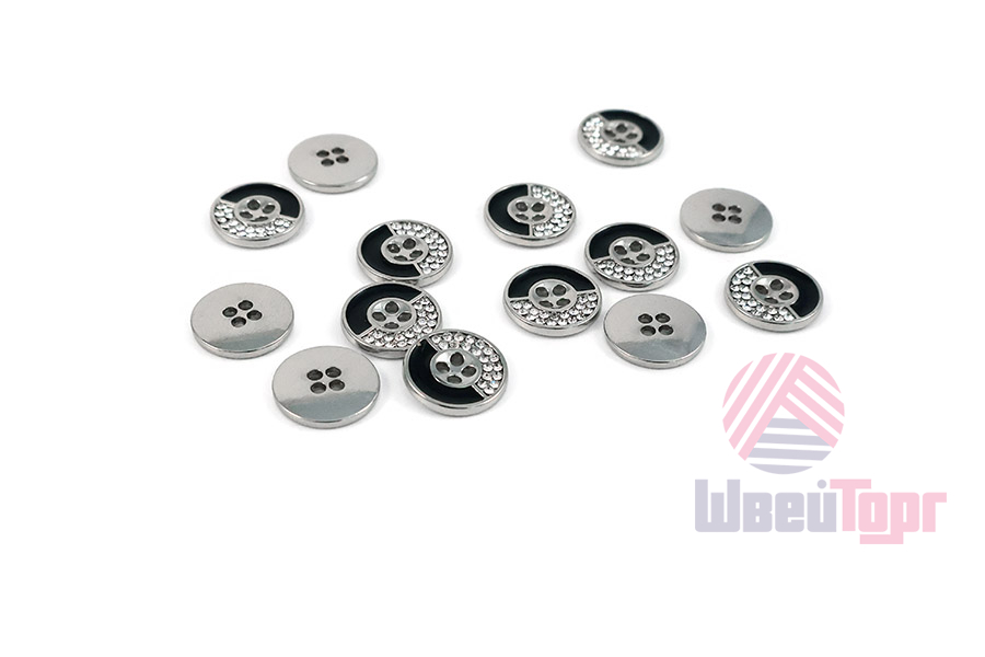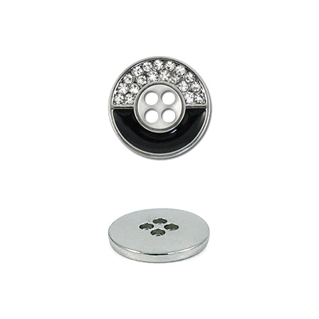 Эта классическая круглая пуговица на четыре прокола легко и надёжно пришивается, идеально подходя для рубашек и стильных блуз. Её оригинальный дизайн привлекает внимание контрастным разделением лицевой стороны: одна половина сияет россыпью мелких стразов, а другая – выполнена в гладком глянцевом чёрном цвете, создавая эффектную и сбалансированную деталь.