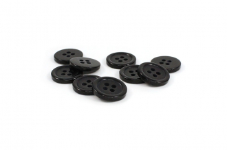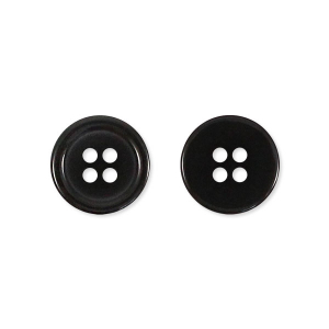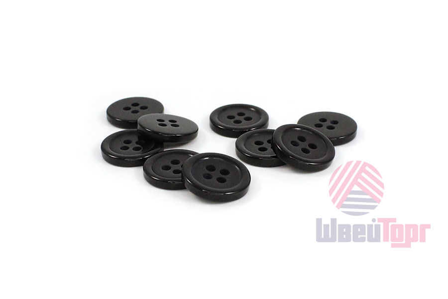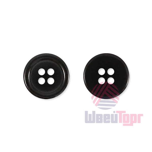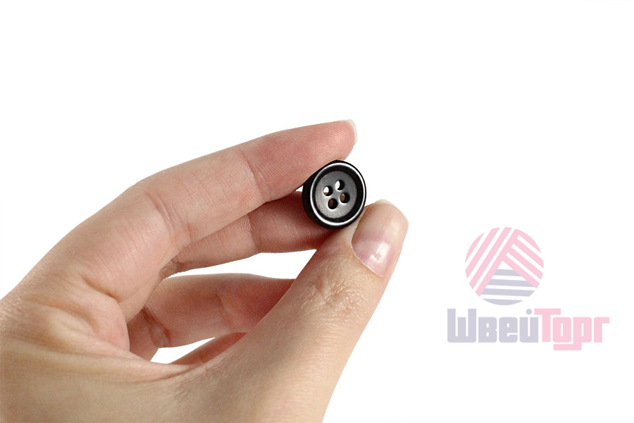 Пластиковые брючные пуговицы на четыре прокола. Лицевую сторону пуговиц окаймляет кольцо шириной 2 мм и небольшое углубление, что придаёт им особый характер. У пуговиц глубокий чёрный глянцевый окрас, что придаёт им ещё более привлекательный вид.