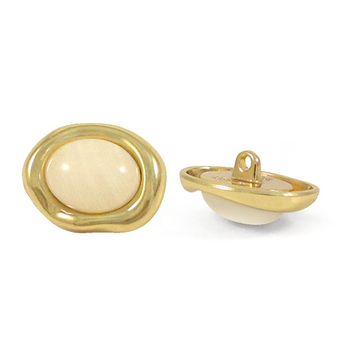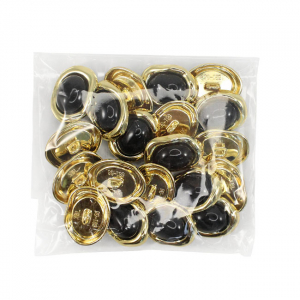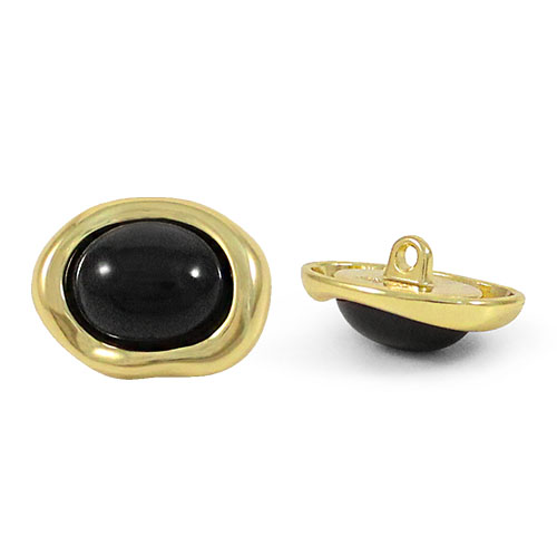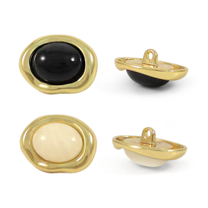 Эта пуговица напоминает миниатюрное произведение искусства. Её основа – стильный асимметричный овал, в центре которого, словно драгоценный камень, сияет выпуклая глянцевая вставка. Обрамленная золотистой «рамкой», она притягивает взгляд своей безупречной чистотой линий и лаконичностью.