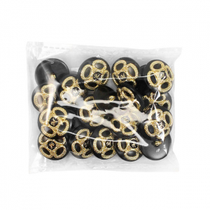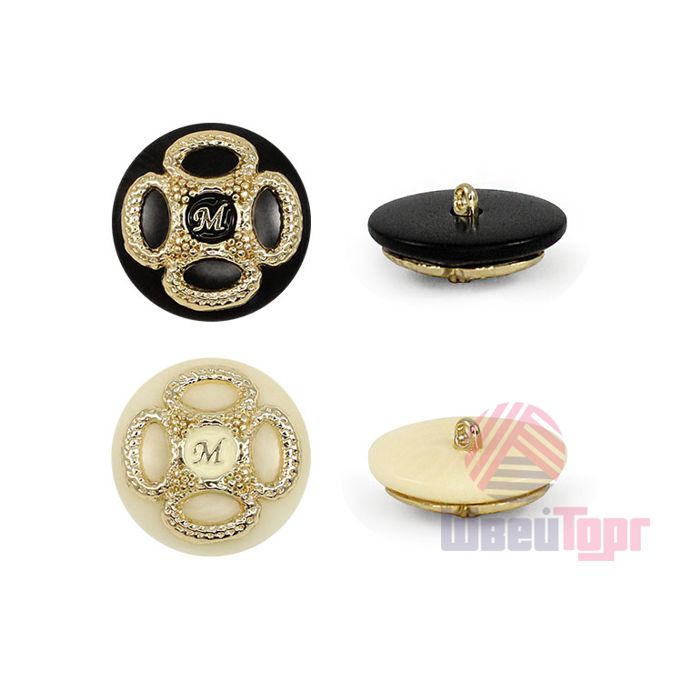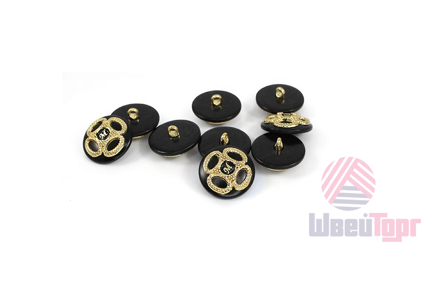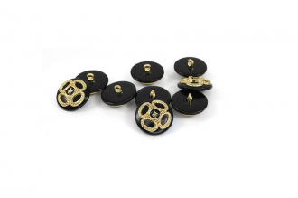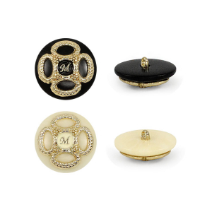 Пластиковая пуговица на ножке с шикарным золотым декором. В центре – буква «M» в обрамлении симметричного позолоченного узора. Доступна в двух классических сочетаниях: крем с золотом и чёрный с золотом. Яркий акцент для создания смелого образа.