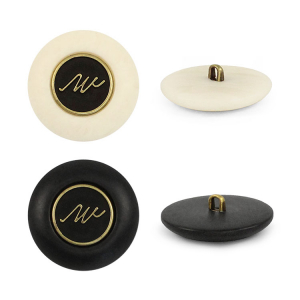 Пластиковая пуговица на ножке для создания стильного образа. Пуговица собрана из двух частей – матовая, с эффектом разводов основа и бронзовый накладной элемент, в виде стилизованной надписи. Сдержанный и интересный элемент для оригинального образа. Пуговица предсталена в двух расцветках: молочный и чёрный.