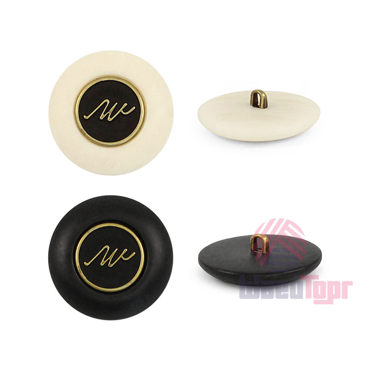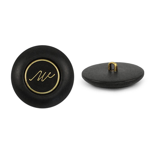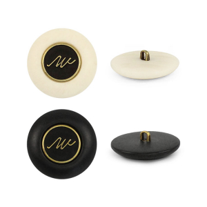 Пластиковая пуговица на ножке для создания стильного образа. Пуговица собрана из двух частей –  матовая, с эффектом разводов основа и бронзовый накладной элемент, в виде стилизованной надписи. Сдержанный и интересный элемент для оригинального образа. Пуговица предсталена в двух расцветках: молочный и чёрный.