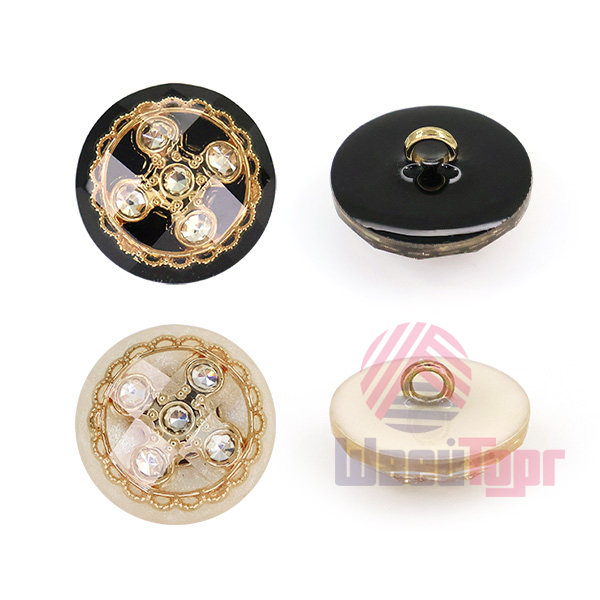 Внутри прозрачной акриловой полусферы с красивыми гранями скрывается настоящее сокровище — композиция из пяти искрящихся страз. Камни заключены в изящное обрамление: тонкое золотое кольцо с филигранным орнаментом, что придает пуговице особую драгоценную эстетику.