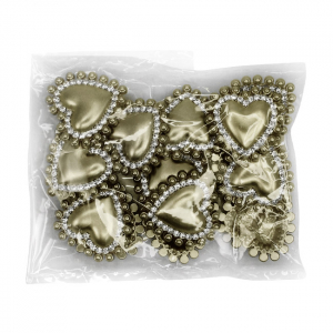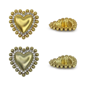 Металлическая пуговица на ножке станет изысканным акцентом вашего наряда благодаря оригинальной форме выпуклого сердечка, украшенного двумя уровнями декора: внутреннее обрамление из сияющих страз и внешний контур из филигранных металлических «бусин». Эта сверкающая деталь идеально дополнит вечерний костюм, жакет или платье, создавая праздничный образ, а выбор между оттенками яркого и тёмного матового золота позволит подобрать идеальное сочетание для любой ткани.