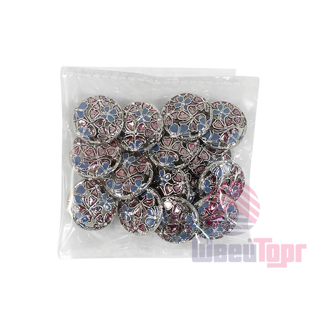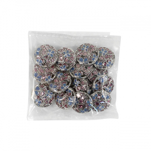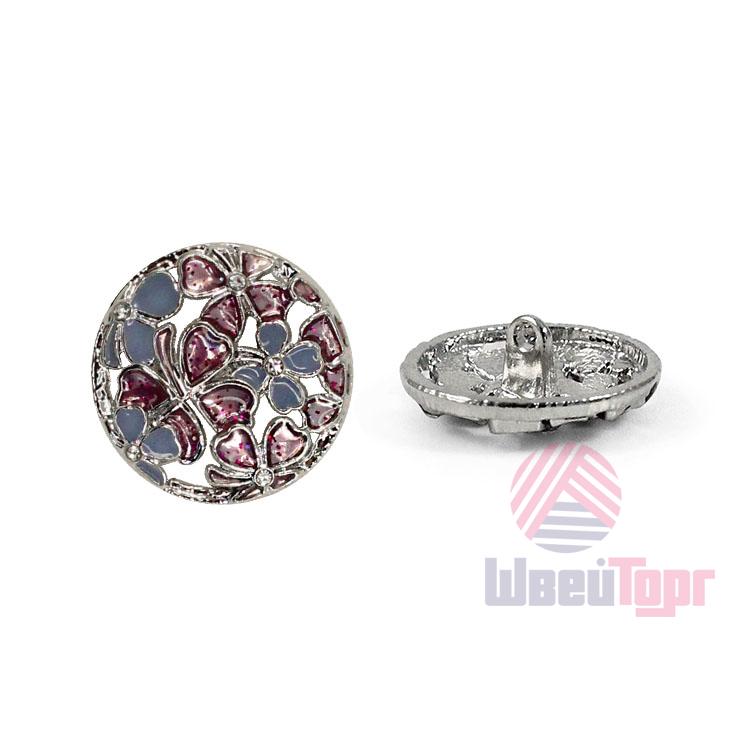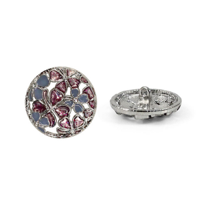 Позвольте вашему наряду расцвести! Эта металлическая пуговица напоминает драгоценную миниатюру. Её сложный, резной дизайн завораживает: основа из серебристого металла подобно кружевной ленте обрамляет нежный букет. Ажурная резьба, образующая букет из голубых и пурпурных соцветий, и лёгкое сияние блёсток делают их маленьким шедевром.