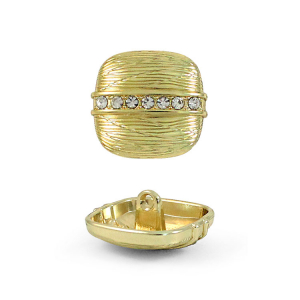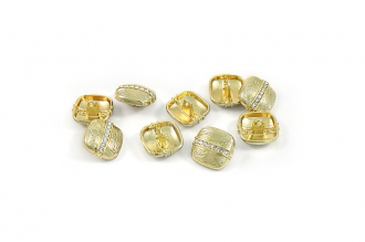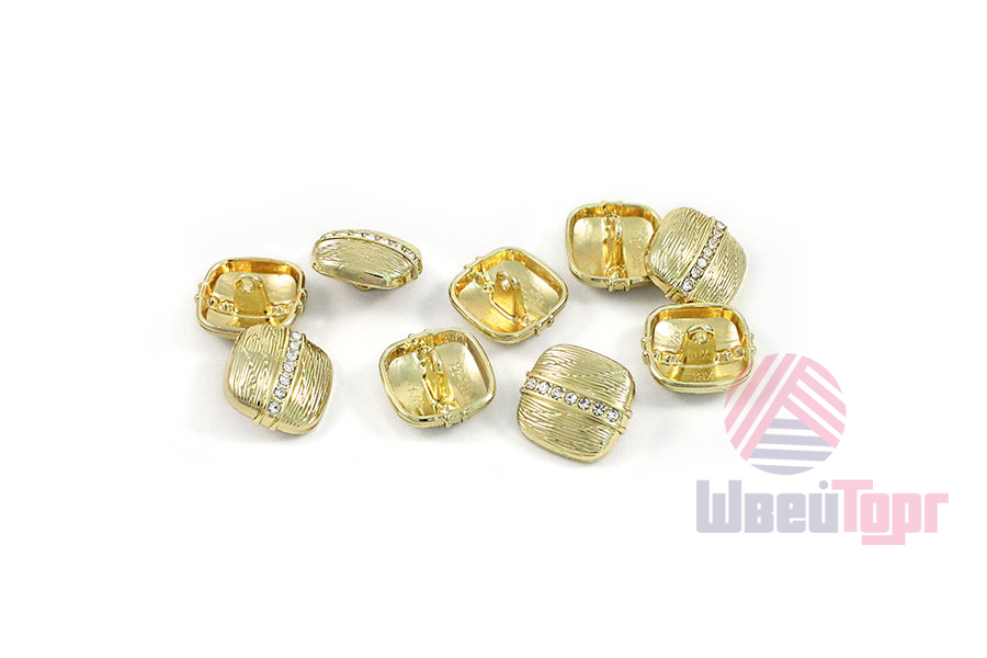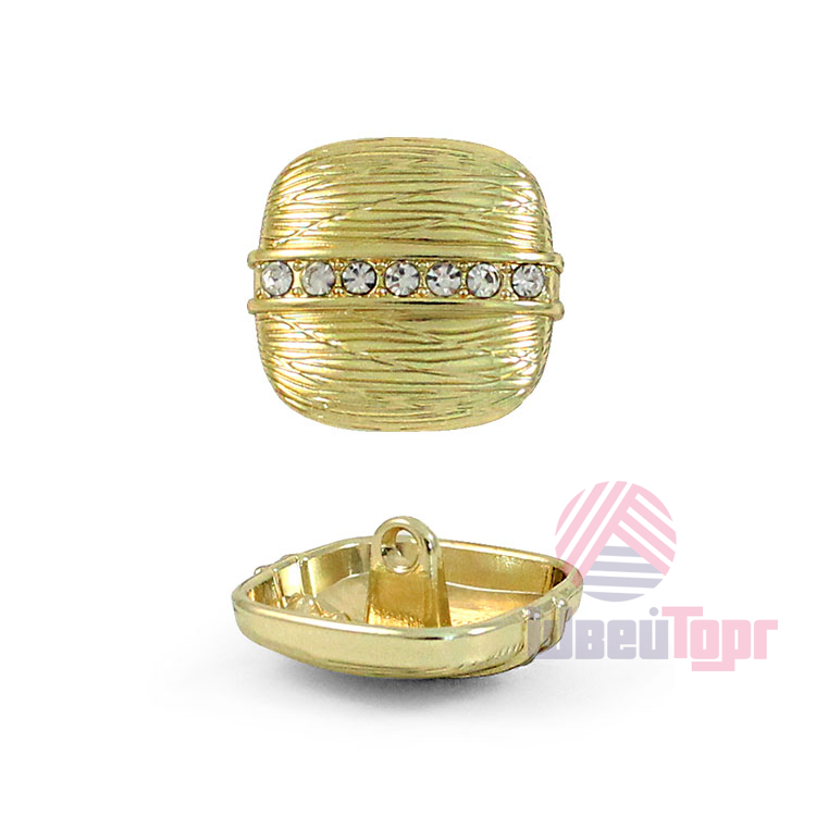 Эта металлическая пуговица на ножке, несмотря на свой материал, удивительно легка и удобна в использовании. Квадратная форма с мягко скруглёнными углами и оригинальная фактурная поверхность, оттенка бледного золота с зеленоватым переливом, создают утончённую основу. Роскошным декором является линия из мелких искрящихся стразов. Пуговица станет идеальным акцентом для костюмов, жакетов и рубашек, придавая им особый шарм и индивидуальность.