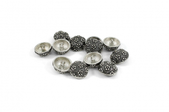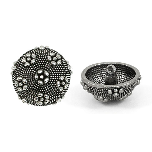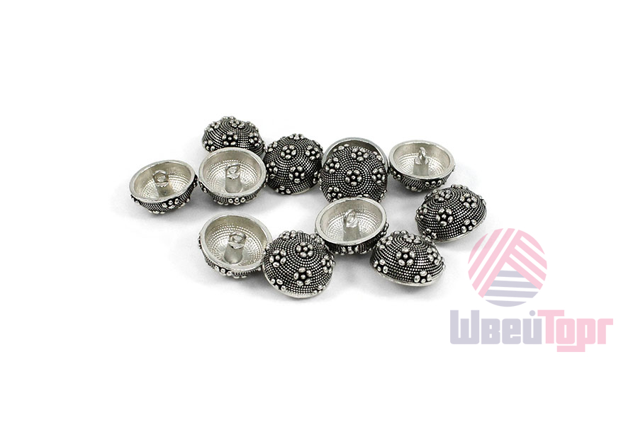 Металлическая пуговица на ножке, диаметр 18 мм, выпуклая форма. У пуговицы оригинальная форма и дизайн - фактурная поверхность, украшенная стилизованными цветками из шариков.
