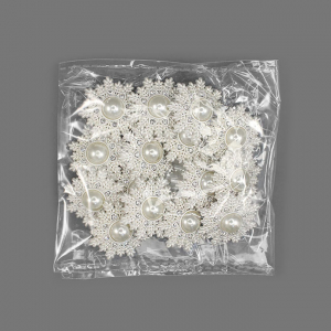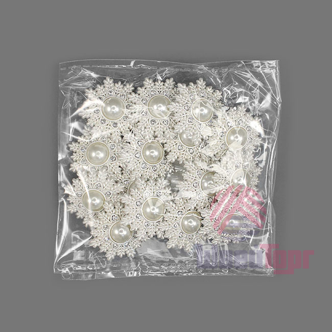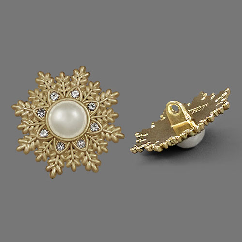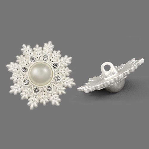 Металлическая пуговица на ножке, диаметр 25 мм. Пуговица имеет оригинальную форму и дизайн – резная снежинка, украшенная крупной перламутровой бусиной в центре.