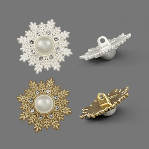 Пуговица доступна в двух цветах – чматовый белый и золотой – оба варианта выгодно подчёркивают фактурную поверхность и добавляют пуговице нотку роскоши. Прочная ножка обеспечивает удобное пришивание, а необычный дизайн делает эту пуговицу настоящим акцентом в вашем образе. Данные пуговицы прекрасно подойдут для ваших костюмов, жакетов или детских предметов одежды.