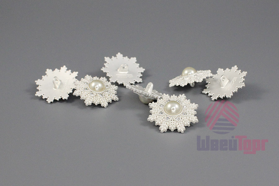 Металлическая пуговица на ножке, диаметр 20 мм. Пуговица имеет оригинальную форму и дизайн – резная снежинка, украшенная крупной перламутровой бусиной в центре.