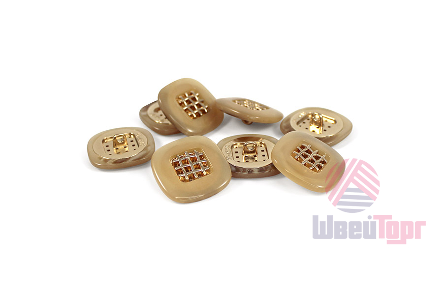Эта пуговица из пластика с лёгким перламутровым эффектом привлечёт внимание изящной деталью: в центре квадрата, с мягко скруглёнными углами, расположена изысканная золотая решётчатая вставка.