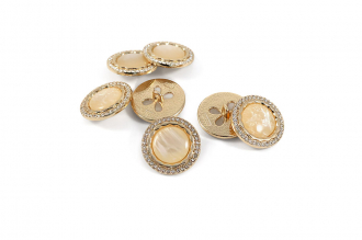 Эта металлическая пуговица диаметром 22 мм на удобной ножке, станет яркой деталью для вашего жакета или костюма. Её золотистая основа по краю украшена россыпью мелких стразов, а центральная выпуклая вставка из акрила, переливающаяся перламутром, добавляет объём и игру света.