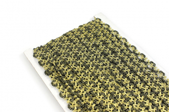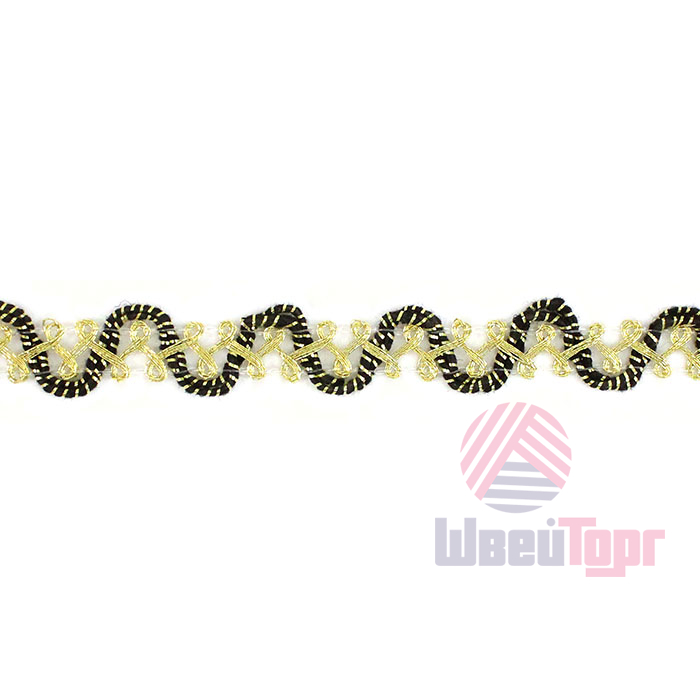 Тесьма доступна в чёрно-золотой расцветке. Она идеально подходит для отделки одежды, декора сценических костюмов, а также для украшения головных уборов и элементов интерьера. Представляет собой прочную плетёную, рельефную тесьму с повторяющимся геометрическим узором. Тесьма пронизана металлизированными нитями, что придаёт ей уникальный блеск. Создавайте свои неповторимые изделия!