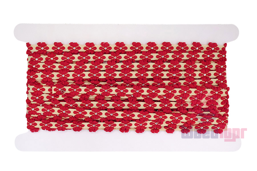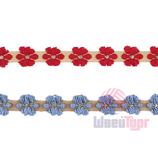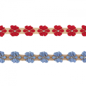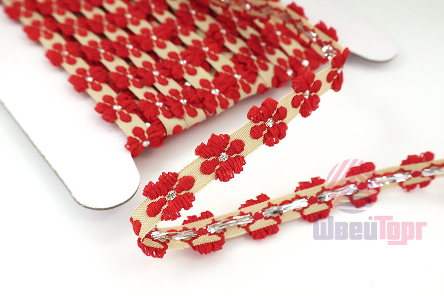 Доступно два варианта расцветки: с голубыми или с красными цветами. Тесьма односторонняя.