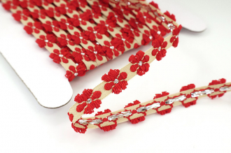 Декоративная, но при этом весьма лаконичная, тесьма с вышитыми объемными элементами в форме шестилистных цветов. Элементы расположены на равном расстоянии посередине бежевой текстильной ленты (ширина бежевой основы около 6 мм). Ширина цветка около 11 мм. Сердцевина каждого цветка украшена серебристым люрексом.