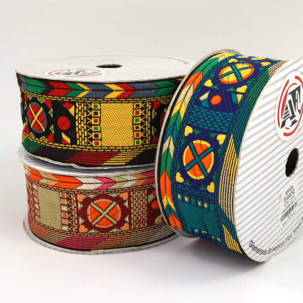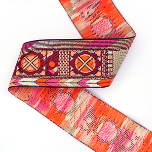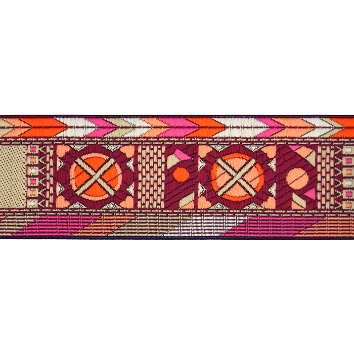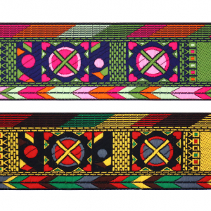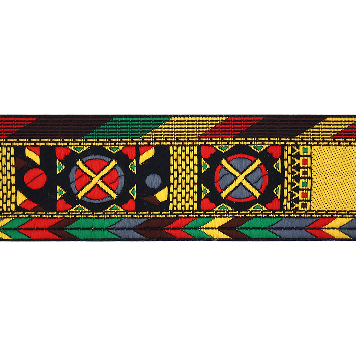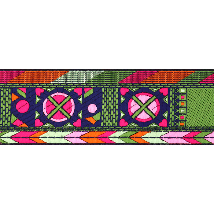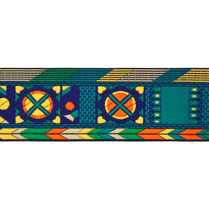 Данная жаккардовая тесьма обладает высокой прочностью, устойчива к растяжению и истиранию. Так как рисунок формируется непосредственно в процессе плетения, что придаёт тесьме эффект вышивки, тесьма сохраняет яркость цветов и не теряет своего внешнего вида долгое время. Рельефный узор тесьмы представляет собой геометрический орнамент. Благодаря высококачественному полиэстеру, из которого она изготовлена, тесьма сохраняет насыщенность цветов даже при частом использовании.
