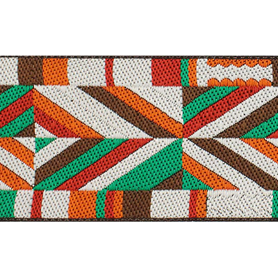 Данная жаккардовая тесьма обладает высокой прочностью, устойчива к растяжению и истиранию. Так как рисунок формируется непосредственно в процессе плетения, что придаёт тесьме эффект вышивки, тесьма сохраняет яркость цветов и не теряет своего внешнего вида долгое время. Рельефный узор тесьмы представляет собой геометрический орнамент. Благодаря высококачественному полиэстеру, из которого она изготовлена, тесьма сохраняет насыщенность цветов даже при частом использовании.