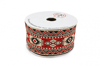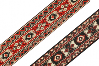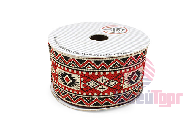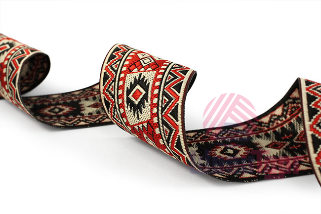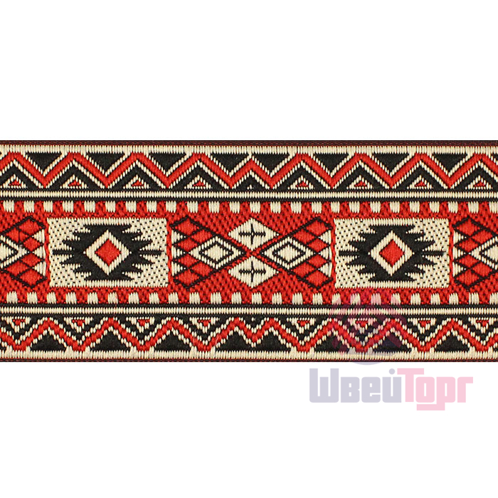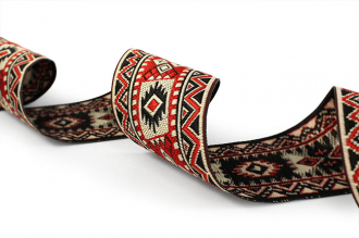 Данная жаккардовая тесьма обладает высокой прочностью, устойчива к растяжению и истиранию. Так как рисунок формируется непосредственно в процессе плетения, что придаёт тесьме эффект вышивки, тесьма сохраняет яркость цветов и не теряет своего внешнего вида долгое время. Рельефный узор тесьмы представляет геометрический орнамент. Благодаря высококачественному полиэстеру, из которого она изготовлена, тесьма сохраняет насыщенность цветов даже при частом использовании.