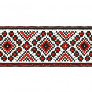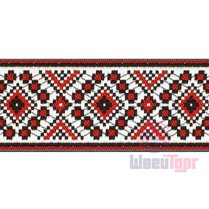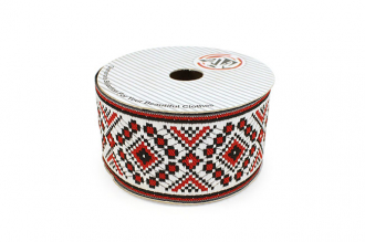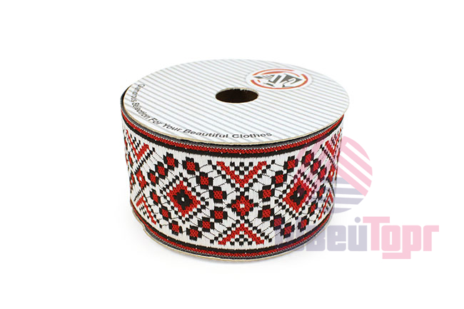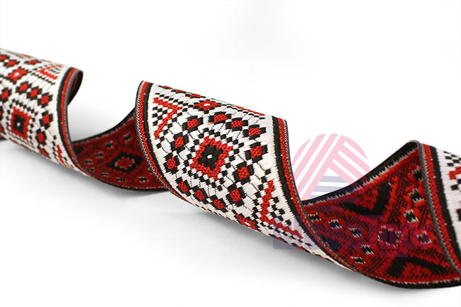 Данная жаккардовая тесьма обладает высокой прочностью, устойчива к растяжению и истиранию. Так как рисунок формируется непосредственно в процессе плетения, что придаёт тесьме эффект вышивки, тесьма сохраняет яркость цветов и не теряет своего внешнего вида долгое время. Рельефный узор тесьмы представляет собой народный орнамент. Благодаря высококачественному полиэстеру, из которого она изготовлена, тесьма сохраняет насыщенность цветов даже при частом использовании.