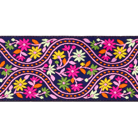Данная жаккардовая тесьма обладает высокой прочностью, устойчива к растяжению и истиранию. Так как рисунок формируется непосредственно в процессе плетения, что придаёт тесьме эффект вышивки, тесьма сохраняет яркость цветов и не теряет своего внешнего вида долгое время. Рельефный узор тесьмы представляет собой геометрический орнамент. Благодаря высококачественному полиэстеру, из которого она изготовлена, тесьма сохраняет насыщенность цветов даже при частом использовании.