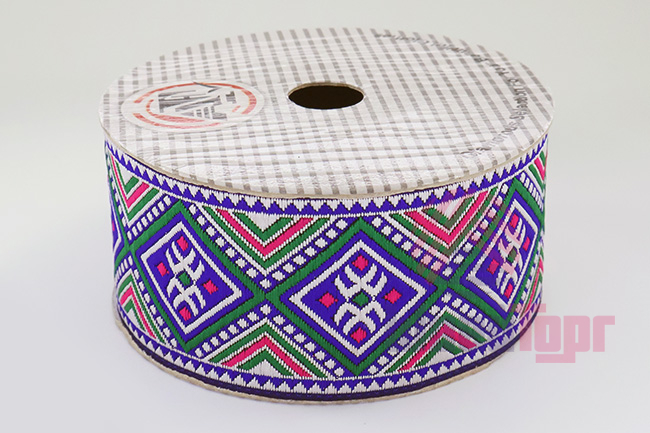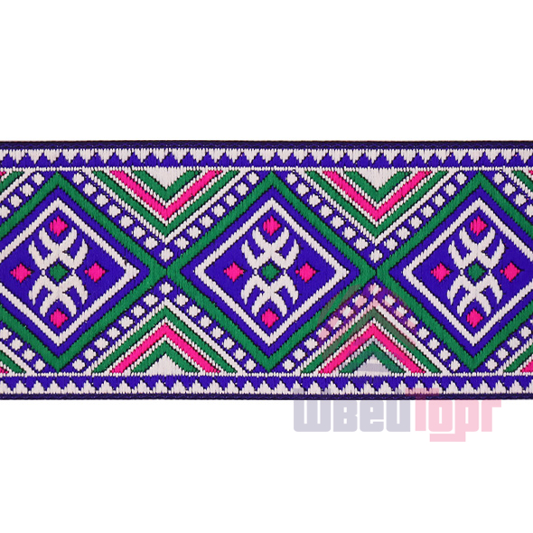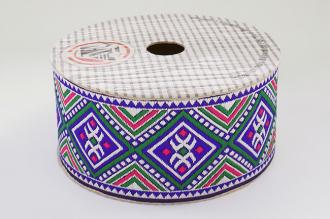 Данная жаккардовая тесьма обладает высокой прочностью, устойчива к растяжению и истиранию. Так как рисунок формируется непосредственно в процессе плетения, что придаёт тесьме эффект вышивки, тесьма сохраняет яркость цветов и не теряет своего внешнего вида долгое время. Рельефный узор тесьмы представляет собой геометрический орнамент. Благодаря высококачественному полиэстеру, из которого она изготовлена, тесьма сохраняет насыщенность цветов даже при частом использовании.