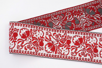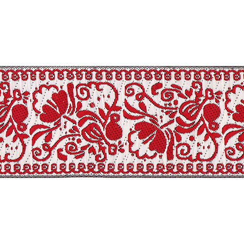 Данная жаккардовая тесьма обладает высокой прочностью, устойчива к растяжению и истиранию. Так как рисунок формируется непосредственно в процессе плетения, что придаёт тесьме эффект вышивки, тесьма сохраняет яркость цветов и не теряет своего внешнего вида долгое время. Рельефный узор тесьмы представляет собой геометрический орнамент. Благодаря высококачественному полиэстеру, из которого она изготовлена, тесьма сохраняет насыщенность цветов даже при частом использовании.