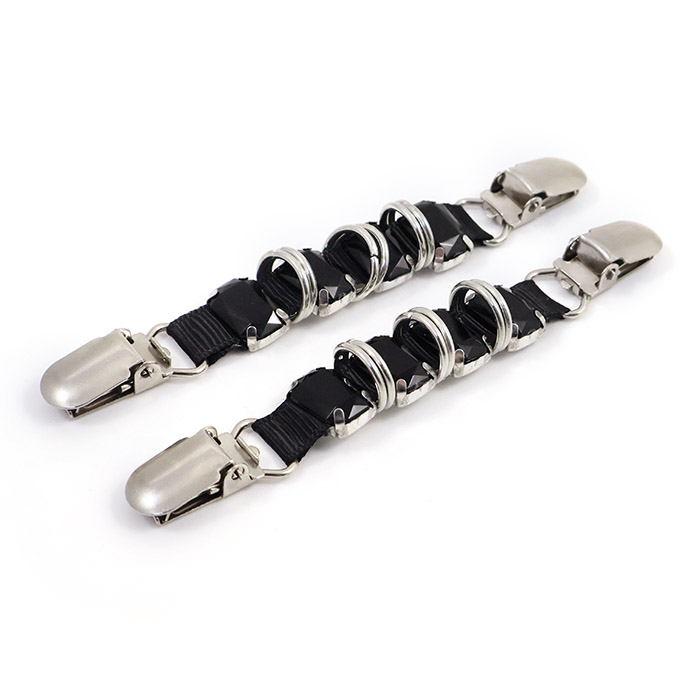 Застёжка для одежды №9089 — это практичный аксессуар, состоящий из двух зажимов-клипс, соединённых лентой с чёрными матовыми стразами и металлическими кольцами.